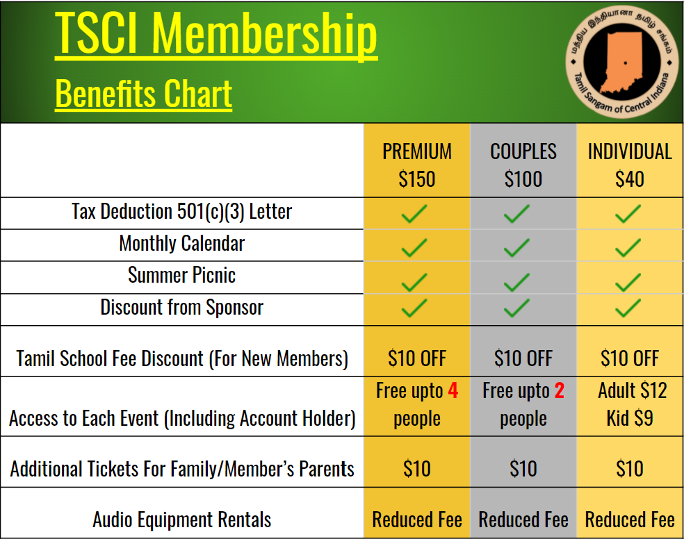 • Discounted tickets for special events arranged by other organizations that are sponsored / supported by the Tamil Sangam.
